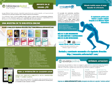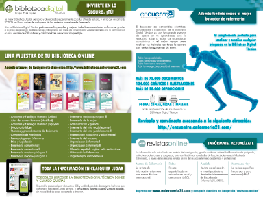 La mejor Biblioteca Digital, pensada y desarrollada especialmente para tus años de estudio, y en la que encontrarás TODOS los libros online de cualquiera de las materias formativas de la carrera de Enfermería. Con la Biblioteca Digital Universitaria y la Biblioteca Digital Técnica podrás consultar, ampliar y mejorar todos los conocimientos enfermeros, gracias a la única recopilación de libros online, catalogados por áreas de conocimiento y especialidades con la participación en ellos de más de 700 autores y colaboradores de reconocido prestigio.